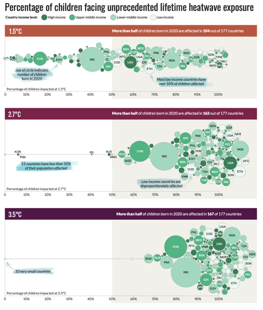 Más de la mitad de los niños nacidos en 2020 (alrededor de 62 millones de personas) experimentarán una exposición sin precedentes a las olas de calor a lo largo de su vida, incluso si el calentamiento se limita a 1,5 °C. Sin embargo, esta cifra casi se duplica, hasta alcanzar los 111 millones, en un escenario en el que el calentamiento alcance los 3,5 °C.