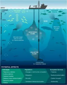 Las operaciones mineras también generan contaminación acústica y lumínica que es peligrosa para los organismos vivos propios de estas partes del océano. Esta actividad plantea una grave amenaza a los ecosistemas marinos, incluida la extinción de especies de aguas profundas, la destrucción irreversible de hábitats, la perturbación de las poblaciones de peces y otros animales acuáticos y la alteración de los ecosistemas.