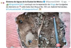 El Sistema de Aguas de la Ciudad de México (SACMEX) comunicó que personal técnico se presentó para atender y reparar la filtración reportada en la calle Cabo San Roque 137, en la colonia Gabriel Hernández de la Alcaldía Gustavo A. Madero.